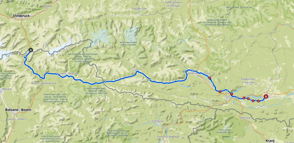 Beim Packen des Werkzeuges kommt es bereits zum ersten Meltdown, nachdem Anja feststellt, wie klein und praktisch Rene’s Radpumpe ist. Nicht ganz zeitig wird schlafen gegangen, denn die Pläne sind ambitioniert. Gestartet wird nach einem morgendlichen Taxidienst vom Brenner Richtung Süden. Dann biegt die Route ins Pustertal ab und führt bis nach Lienz. Dort hoffen wir, eine geeignete Unterkunft zu finden. Am zweiten Tag folgen wir der Drau bis nach Klagenfurt, wobei wir am Weg noch den ein oder anderen Abstecher an den Kärnten Seen beabsichtigen – soweit zumindest der Plan.